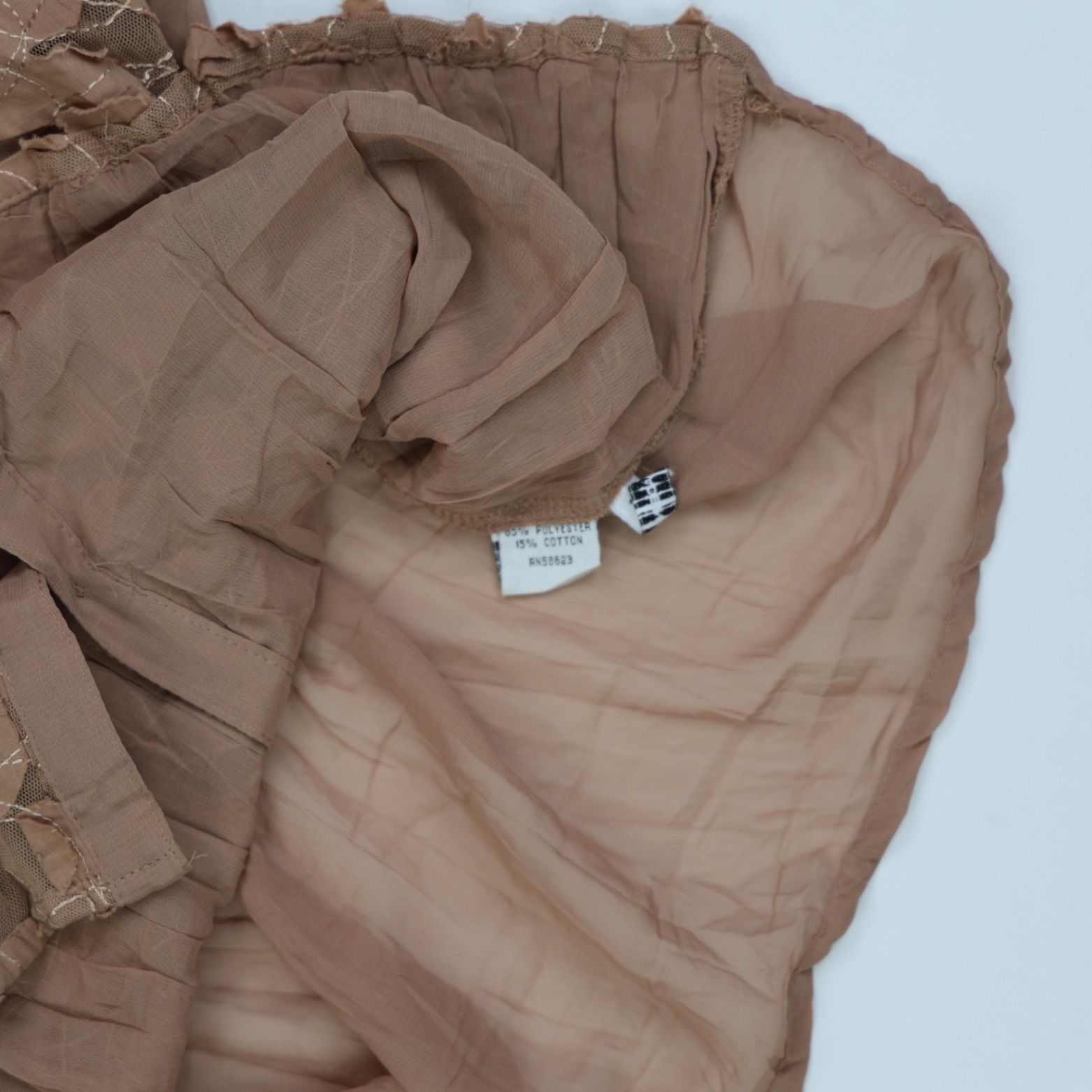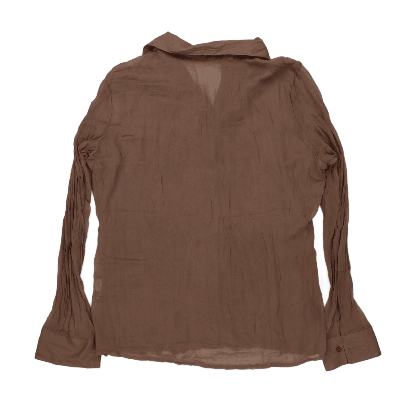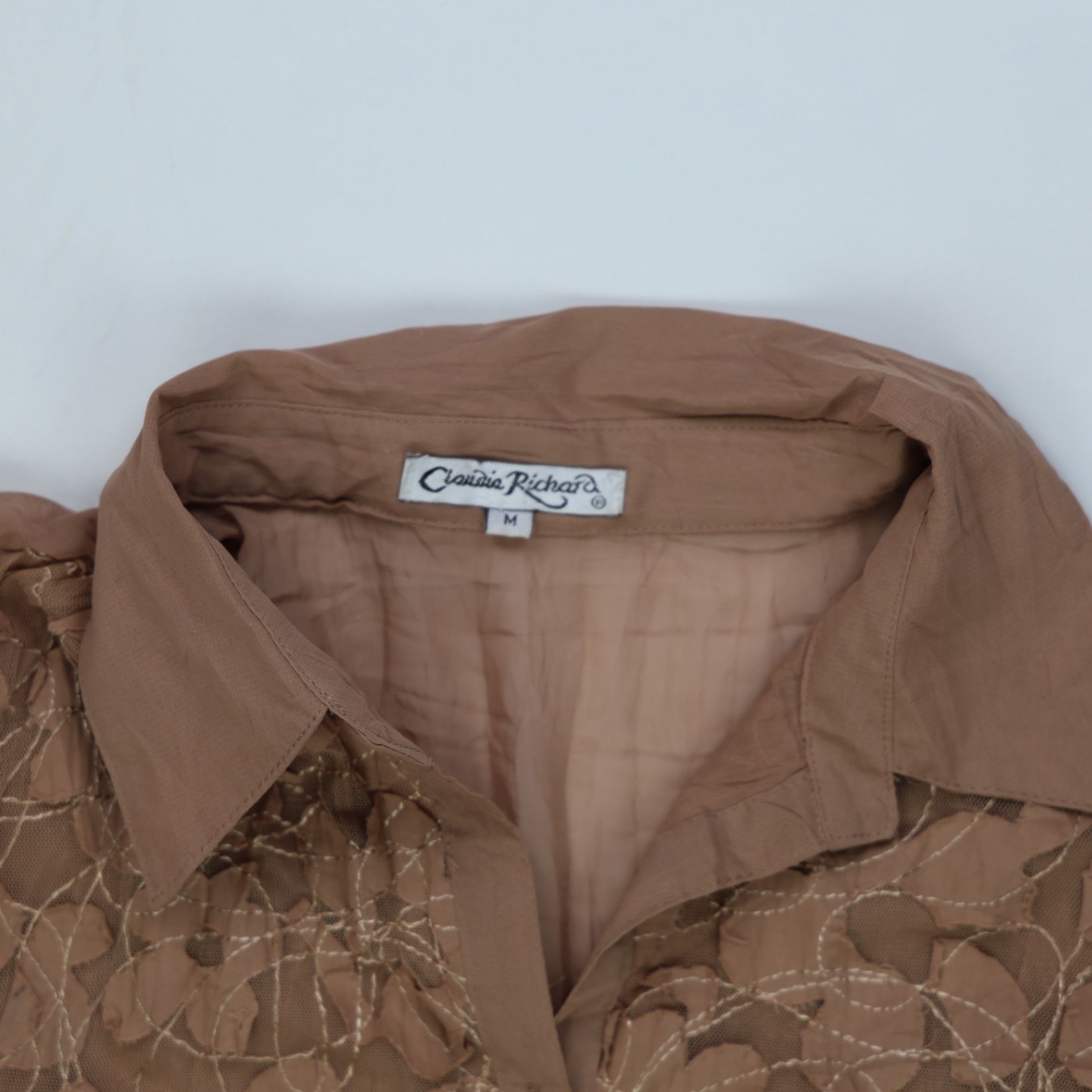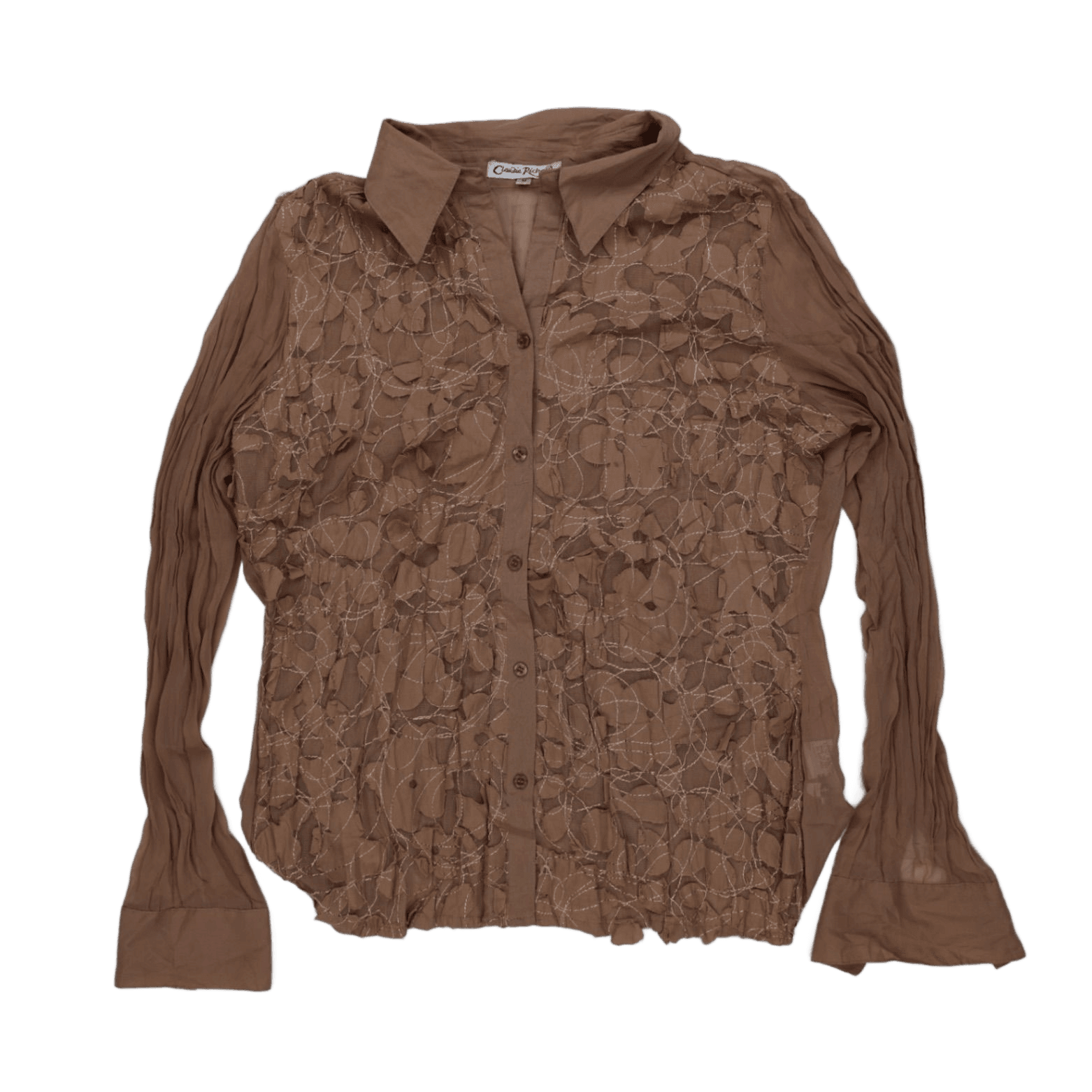 Elevate your wardrobe with the Clarisa Richard Brown Sheer Embroidered Button-Up Shirt, crafted for those who value both elegance and versatility. This exquisite blouse is made from a high-quality blend of 55% polyester and 45% cotton, ensuring breathability and comfort throughout the day. The delicate sheer brown fabric is adorned with intricate embroidery, making it perfect for layering over camisoles or wearing as a statement piece. Designed with long sleeves and a classic button-up front, this medium-size blouse creates a flattering silhouette suitable for both office and casual outings. Pair it effortlessly with tailored trousers or jeans for a chic, sophisticated look. Ideal for day-to-night transitions, this blouse will become a cherished staple in your collection.
