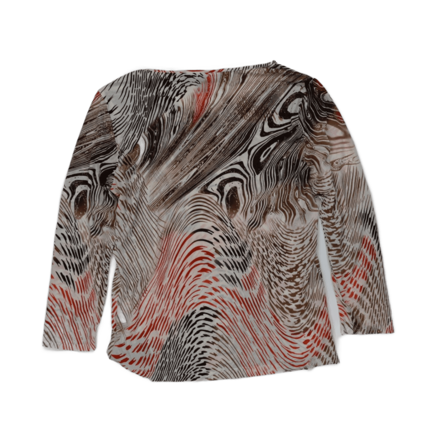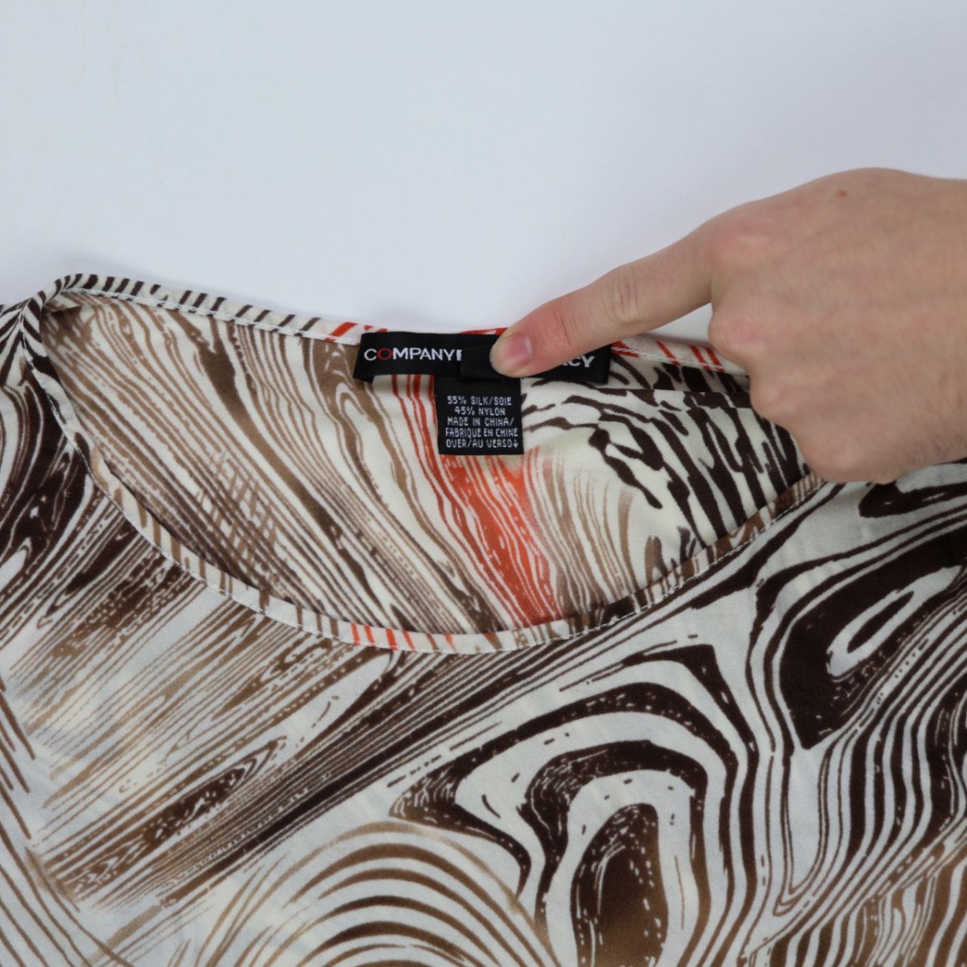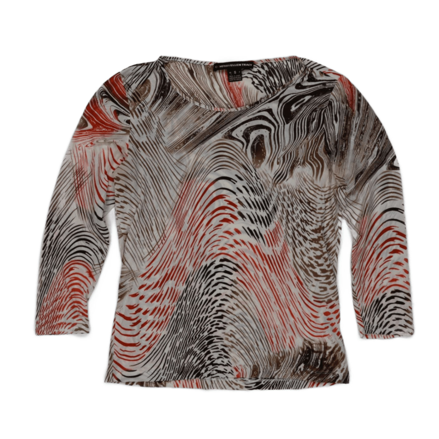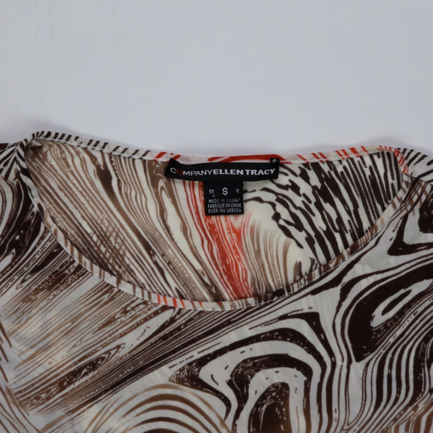 Elevate your wardrobe with the Ellen Tracy Company Silk Blend Multicolour Abstract Top in Size Small, expertly crafted from a luxurious blend of 55% silk and 45% nylon. This blouse showcases a distinctive and artistic print in shades of brown, cream, black, and hints of coral, delivering a modern flair to everyday elegance. The long sleeves and soft, breathable fabric make this top perfect for both smart-casual office wear and sophisticated evening gatherings. Enjoy a lightweight and comfortable fit suitable for all-day wear, paired effortlessly with trousers or skirts for a chic, versatile look. Add a pop of abstract artistry and refined style to your collection, and experience the unrivalled comfort and quality from Ellen Tracy.