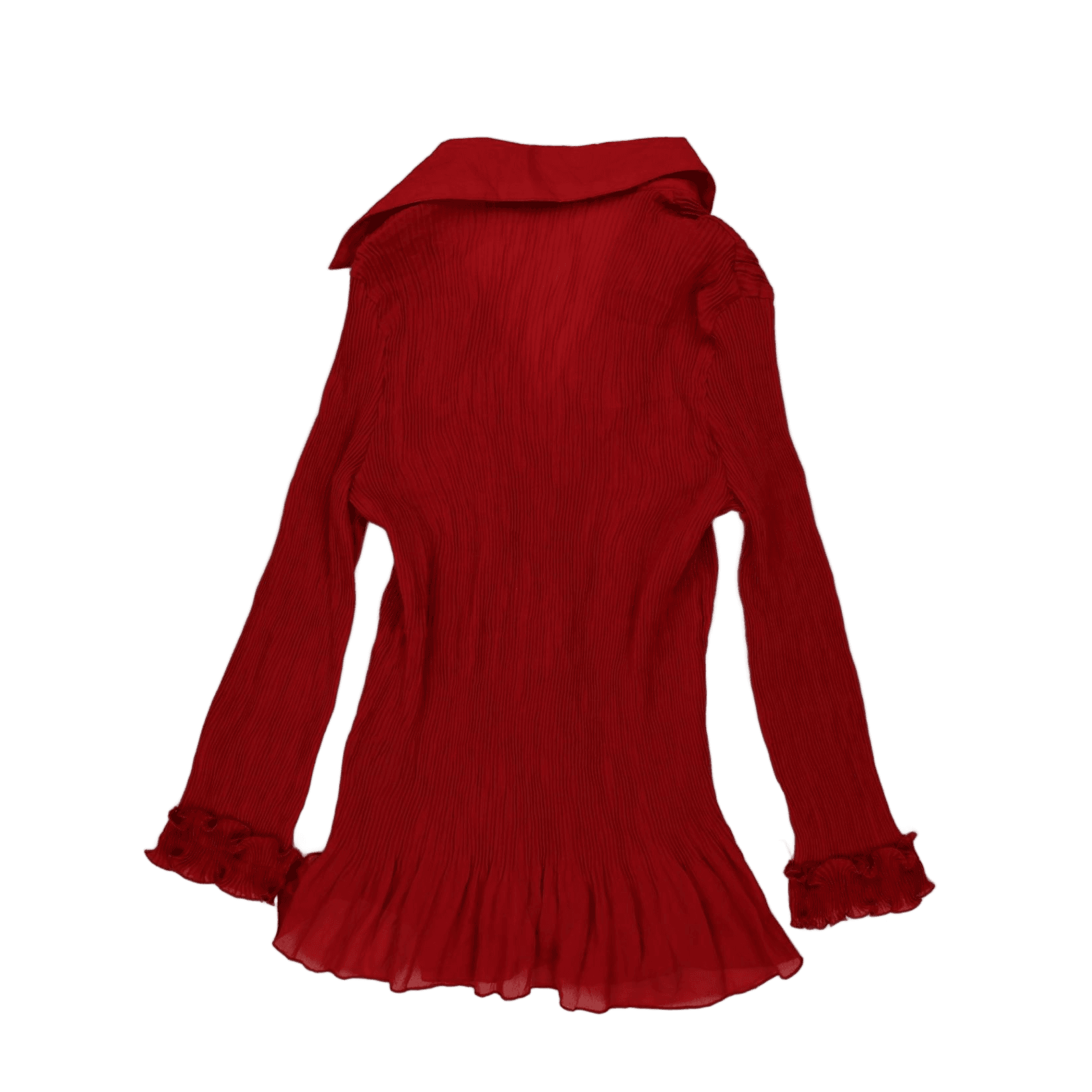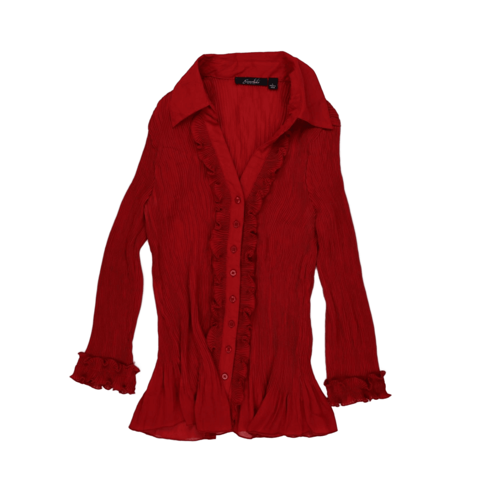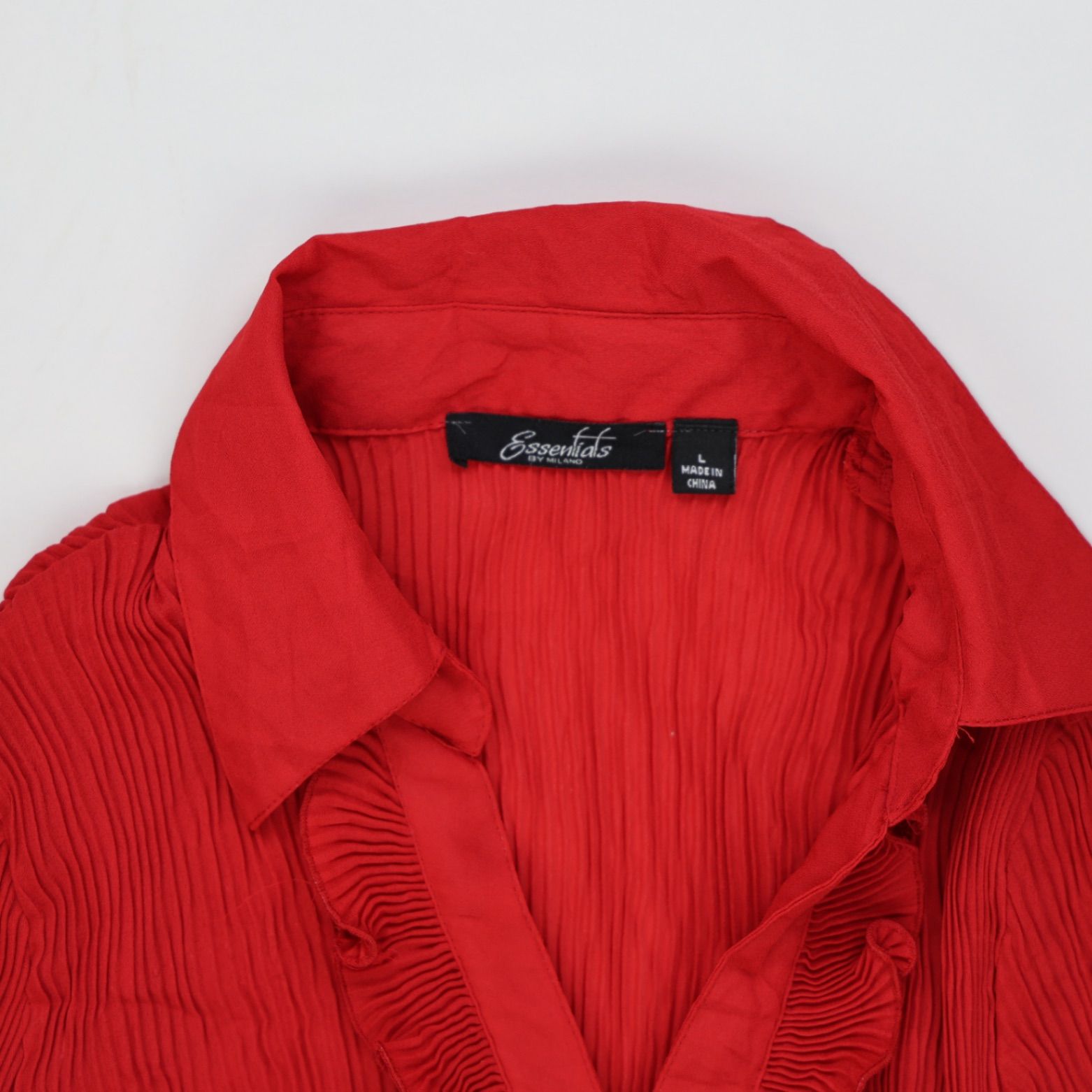 Elevate your wardrobe with the striking Essentials Red Pleated Ruffle Front Long Sleeve Blouse, expertly crafted for both day and evening wear. This elegant button down shirt features a classic collared neckline, intricate ruffle detailing along the placket and cuffs, and stunning pleated texture throughout for sophisticated movement and grace. Made from lightweight 100% polyester, this blouse offers a comfortable fit and a flattering silhouette in size Large. The bold red hue brings a touch of vibrancy to any outfit, making it perfect for office attire or special occasions. Pair it effortlessly with smart trousers or a sleek skirt and step out with confidence in timeless style.